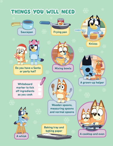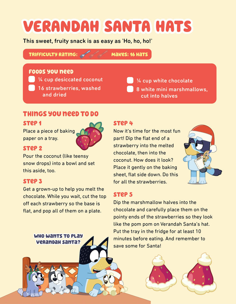 Let’s cook for Christmas! Join Bluey and Bingo for the holidays and learn how to make Bartlebee toast, strawberry Verandah Santa hats, gingerbread biccies, roast pork with crackling – and more!