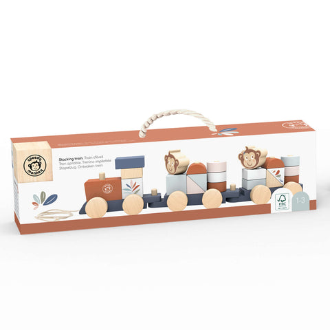 A fun wooden pull-along train stacker, painted in trending soft colours and featuring our favourite character, the monkey. Your little one will have hours of fun, stacking elements on the train and building houses with colourful blocks. Once all aboard, the choo choo train departs for a new adventure! This toy is crafted from sustainably sourced wood from FSC® certified forests and coated with non toxic paint.