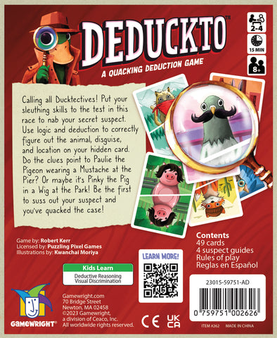 Calling all Ducktectives - put your sleuthing skills to the test in this race to nab your secret suspect. Use logic and deduction to figure out the animal, disguise and location on your hidden card.