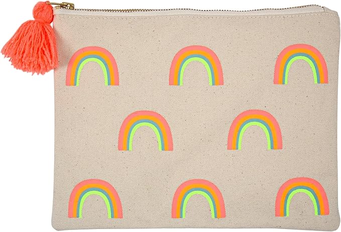 The Meri Meri Rainbows Canvas Pouch is a stylish and functional accessory featuring a vibrant, neon-coloured rainbow pattern on natural cotton canvas. This durable pouch includes a cotton lining and a playful coral pom-pom zipper, making it ideal for storing stationery or personal items. It is a versatile, high-quality item designed by the brand.